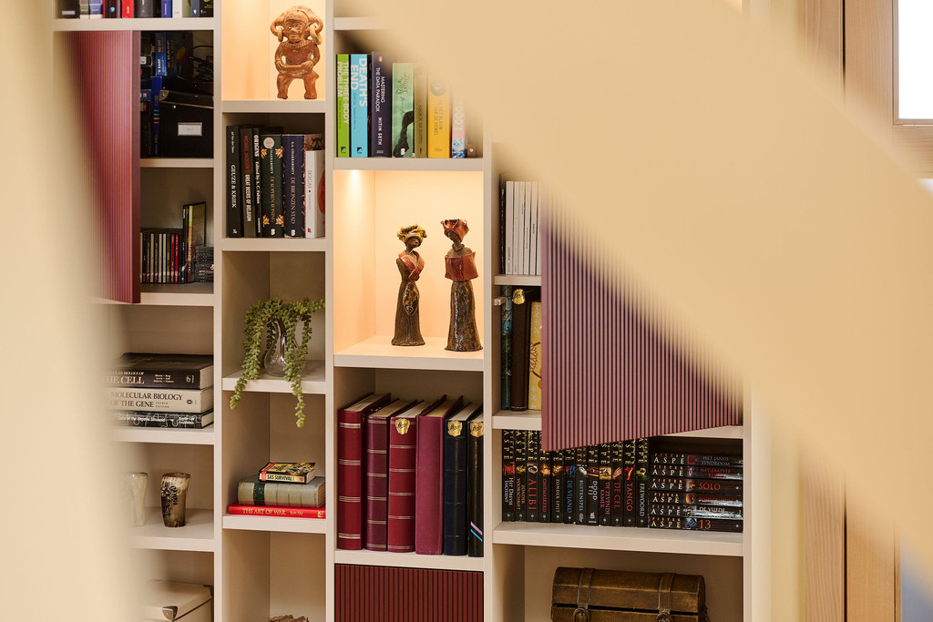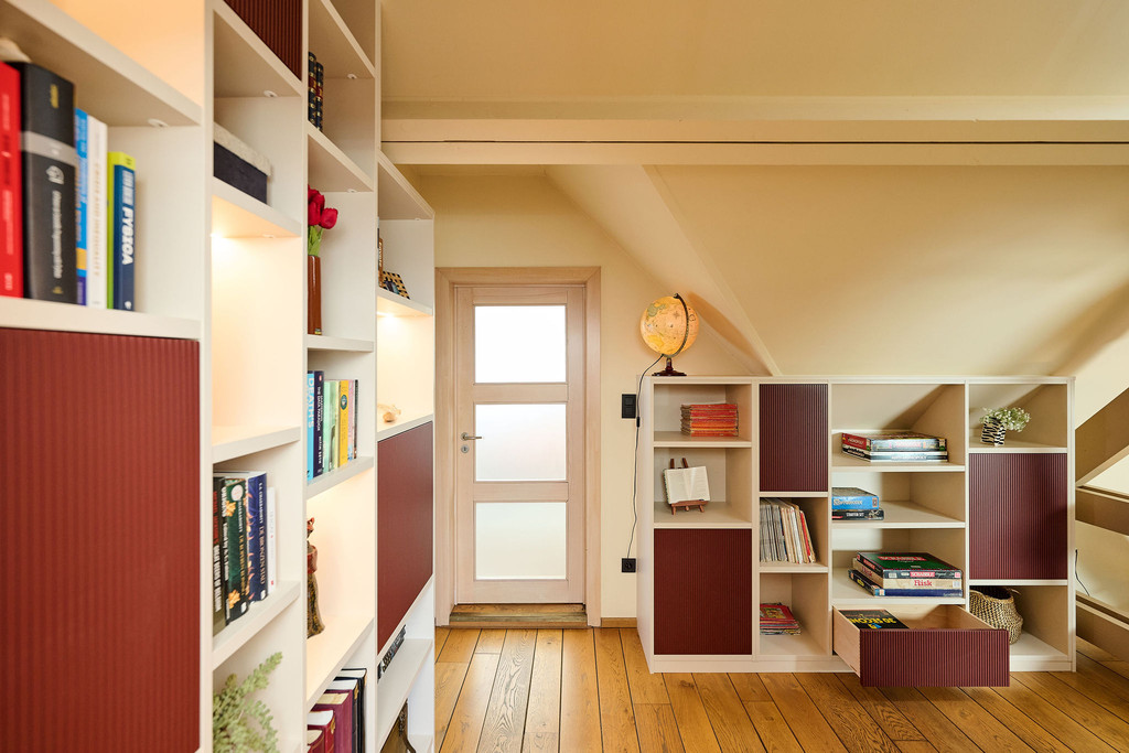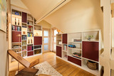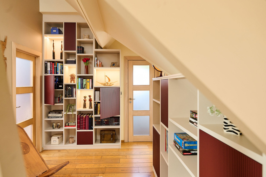 Bibliothèque sur mesure avec espace de rangement intégré sous pente