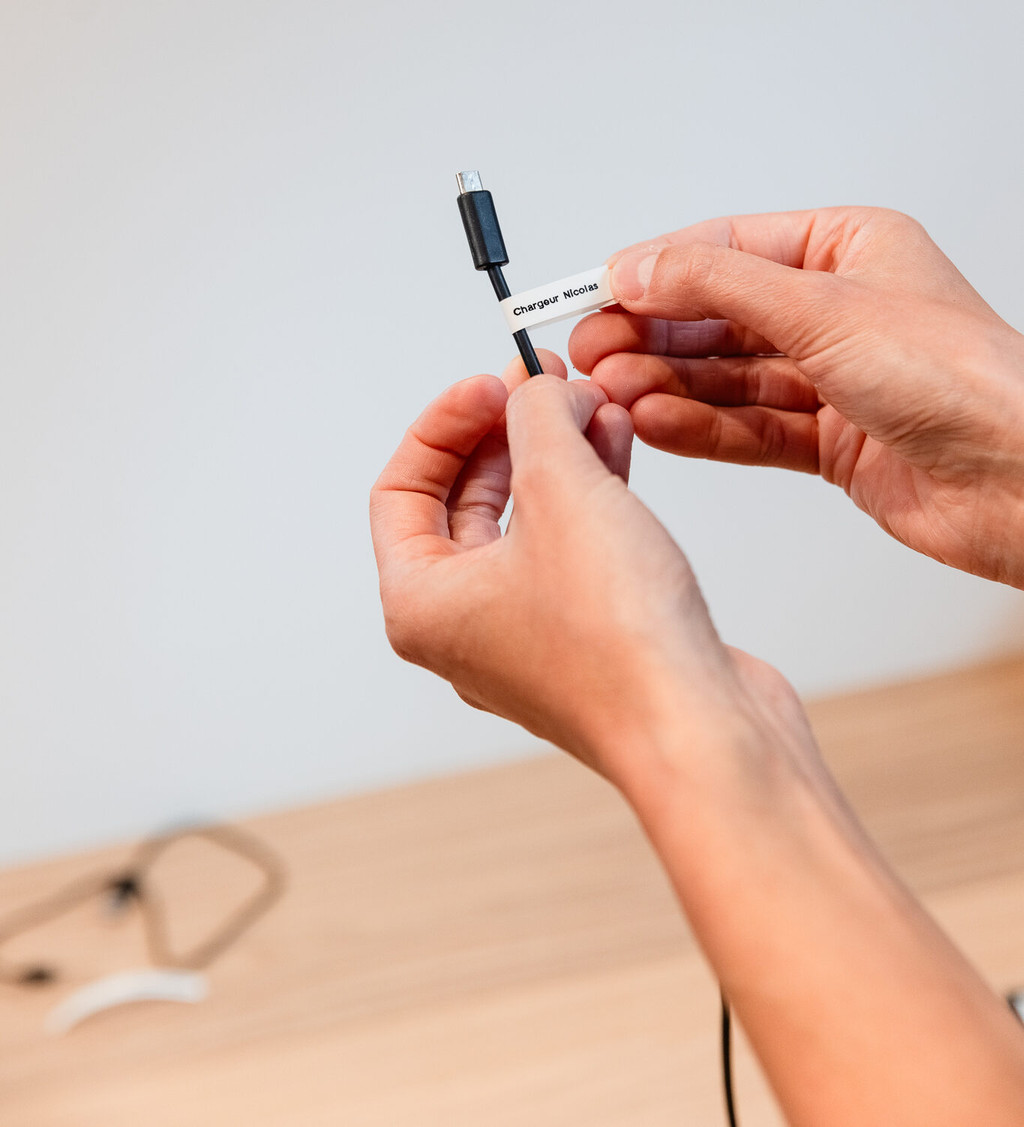 Une étape souvent négligée mais redoutablement efficace : l’étiquetage. En ajoutant une petite étiquette avec un nom, une pièce ou un appareil, vous identifiez immédiatement chaque câble. Très pratique lors d’un réaménagement du bureau ou lorsque plusieurs personnes utilisent le même espace. Inscrivez sur l’étiquette le nom de la personne qui utilise le câble. Si tout le monde utilise les mêmes chargeurs, indiquez plutôt la pièce de la maison où il est habituellement utilisé ou l’appareil auquel il appartient.
