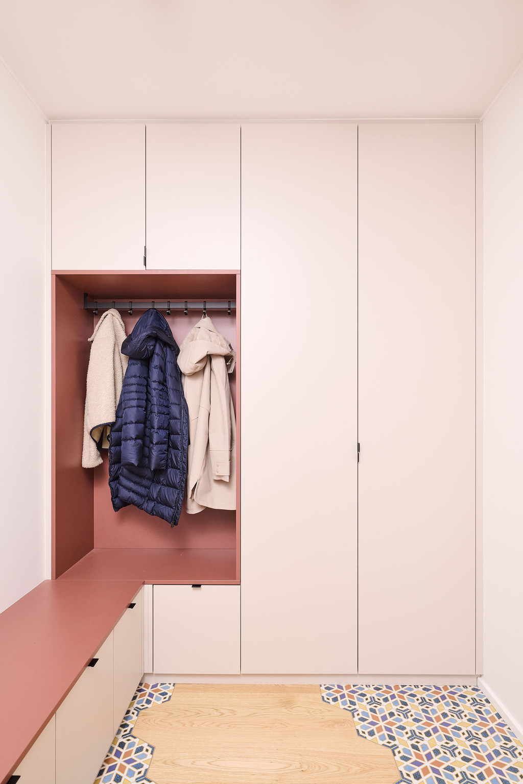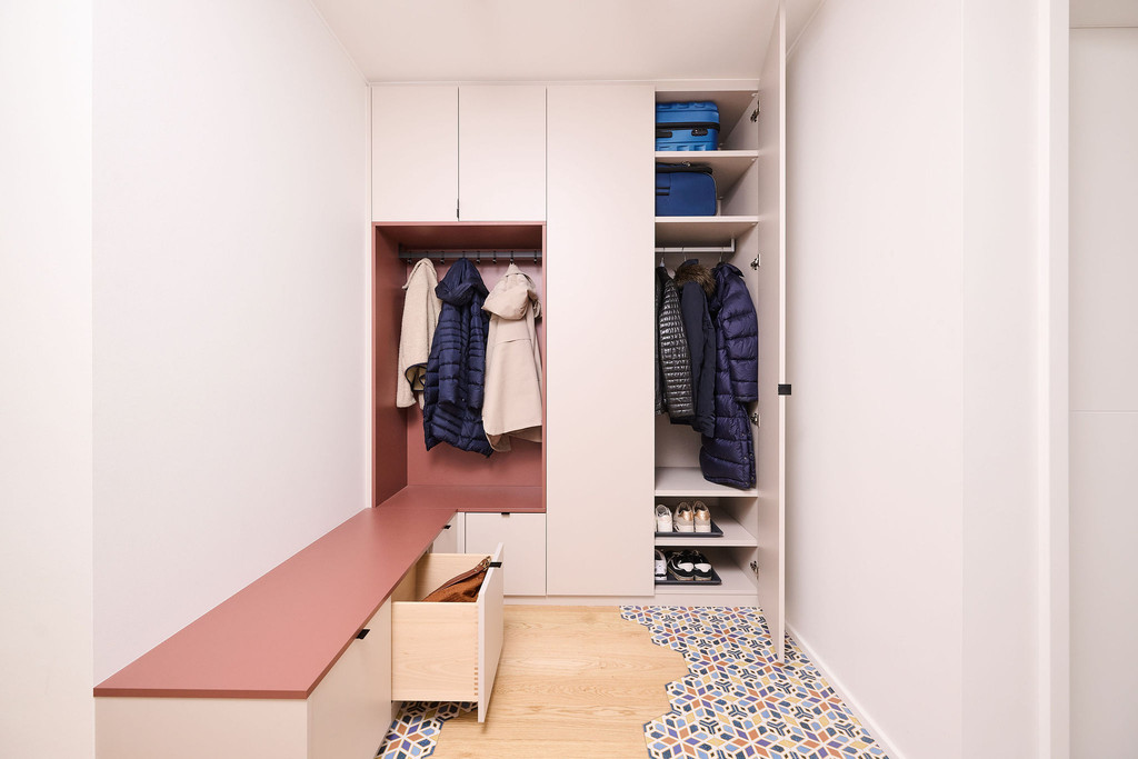 Comme la famille aime recevoir, le hall d’entrée était une priorité. Il devait être accueillant, mais surtout pratique, aussi bien pour les enfants que pour les invités. Deborah a conçu un vestiaire sur mesure combinant espace de rangement, ergonomie et esthétique. Vestes, chaussures et accessoires y trouvent naturellement leur place, tandis que le design compact conserve une entrée ouverte et lumineuse.
