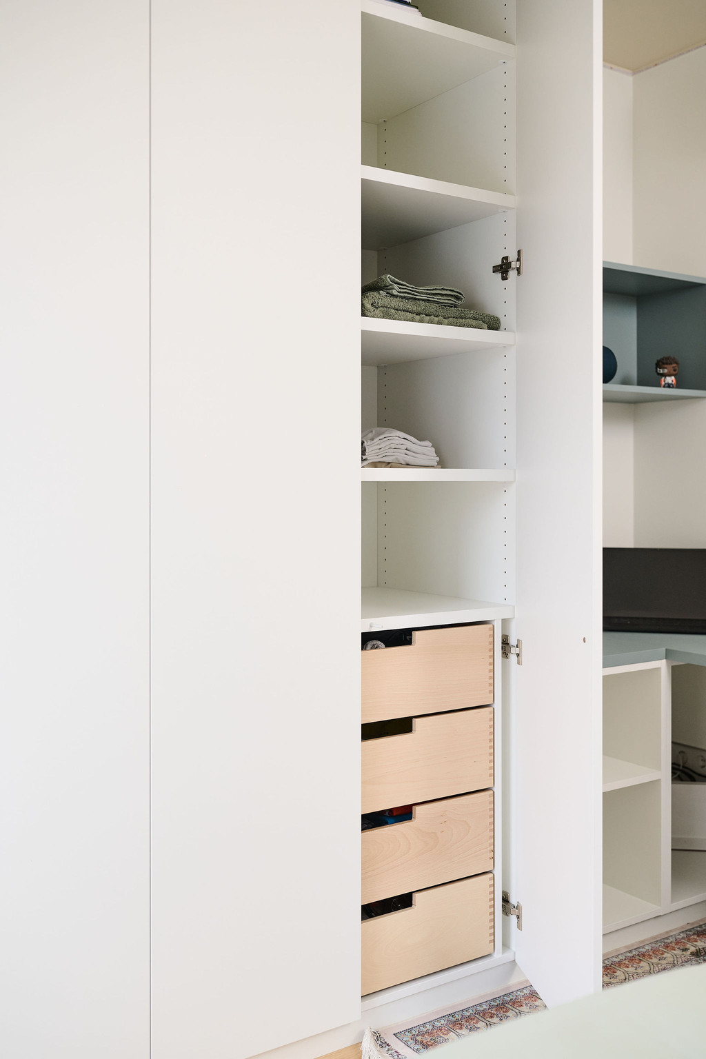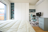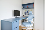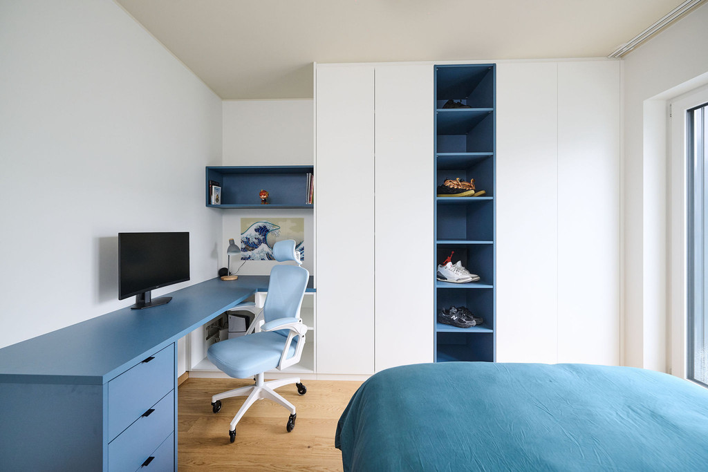 Avec trois adolescents à la maison, il était essentiel d’aménager chaque chambre de manière intelligente et durable. Deborah a combiné dans chaque pièce un bureau fonctionnel et une armoire sur mesure, permettant de concilier études, rangement et détente dans un ensemble cohérent. Des lignes épurées, un éclairage adapté et une organisation logique créent des chambres d’adolescents calmes, tout en offrant toute la fonctionnalité nécessaire au quotidien.