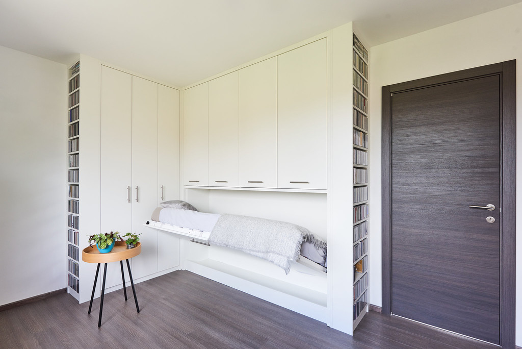 Le lit escamotable est probablement une des solutions les plus étonnante pour optimiser de l’espace. En plus d’offrir un gain d’espace considérable, il passe complètement inaperçu en se fondant parfaitement dans le décor et redonne la fonction initiale de la pièce en un rien de temps. Bref, un must have pour les petits espaces.