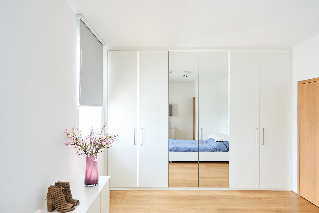 Plusieurs astuces existent pour agrandir visuellement la pièce. Une solution 2 en 1 sur mesure est celle des portes coulissantes munies de miroirs placés sur les portes. Grâce à cette option pratique, vous fluidifiez la circulation dans la pièce mais vous économisez de l’espace en évitant de devoir installer un miroir sur pied dans une pièce déjà potentiellement fort chargée. Vous pouvez aussi opter pour un miroir à l’intérieur de la porte.
