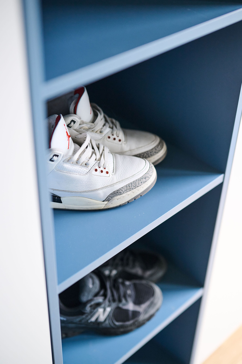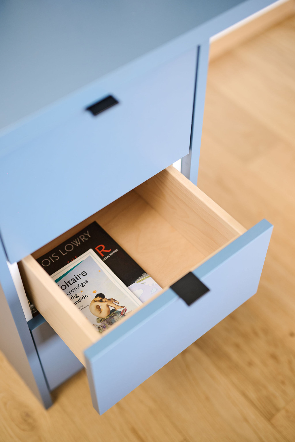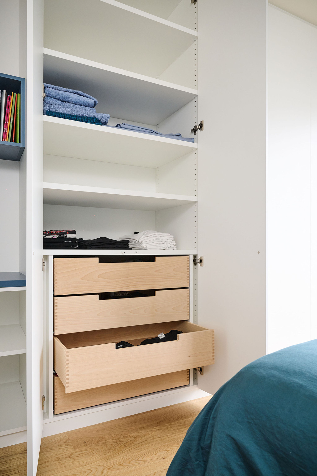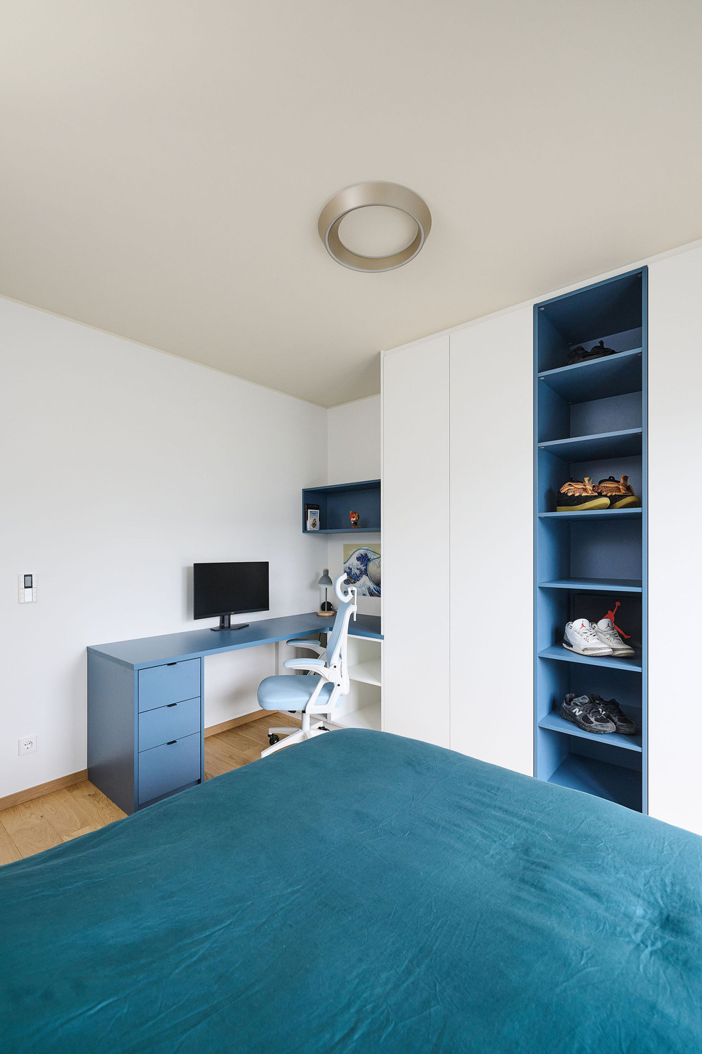 Tienerkamer met blauw bureau en witte maatkast